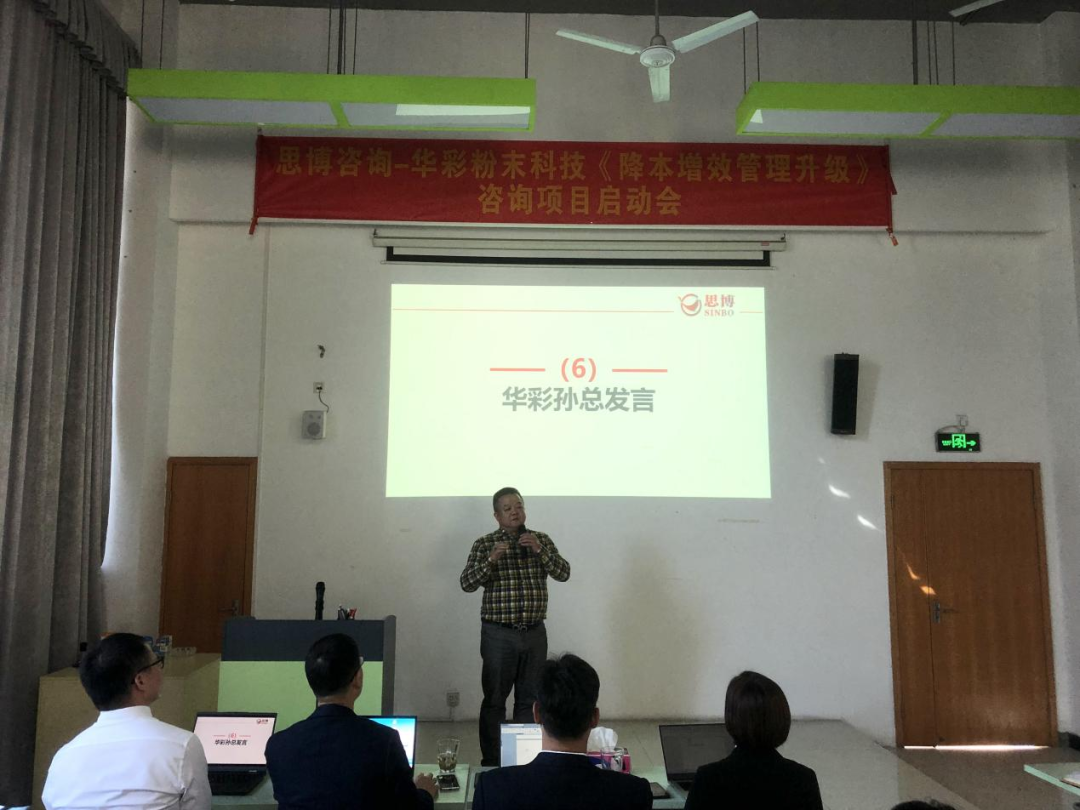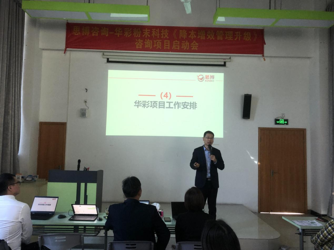 近日,廣東華彩粉末科技有限公司(簡稱“華彩”)攜手思博落地《降本增效管理升級》輔導咨詢項目。以華彩孫總為代表的各核心管理層團隊和以思博咨詢項目組為代表的專家老師團隊列席參加,共同見證管理改革升級的開始。 思博項目組發言